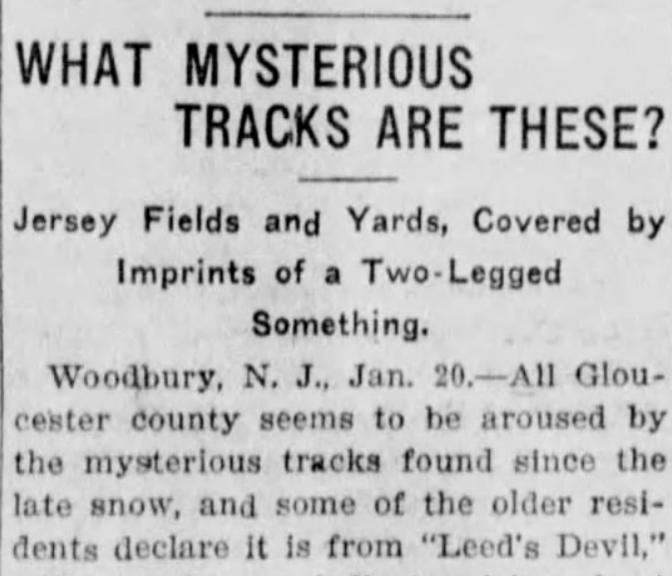 The most interesting sighting of this time period was when the Jersey Devil allegedly attacked a trolley car in Haddon Heights where it was fully seen by multiple witnesses. However, journalistic standards were much lower at that time, and none of these witnesses are available to interview, so we consider this event unlikely. The first news story did not even claim the witness saw the cryptid. Councilman E.P. Weeden of Trenton claimed to have heard wings flapping prior to seeing the tracks.