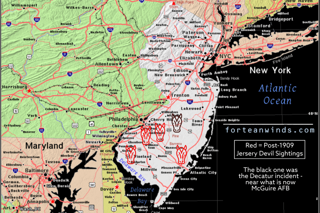 For now, we have one more interesting observation: The Stephen Decatur (cannonball to the beast) incident allegedly occurred near what is now McGuire Air Force Base, and the more interesting post-1909 sightings cluster around the same area. Decatur did not describe the “Leeds Devil” with a horse’s head.